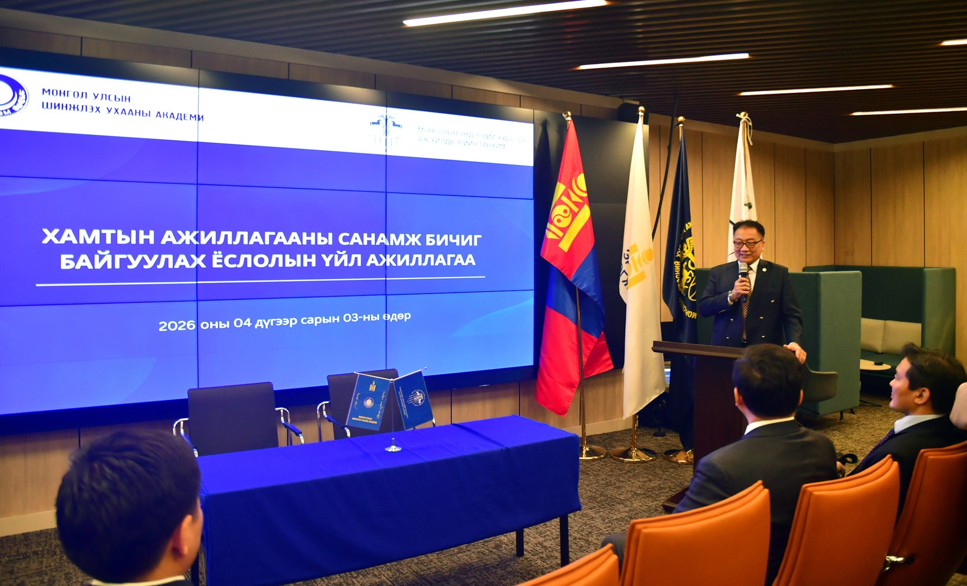 “Судалгаанаас бизнес рүү” арга хэмжээ нь шинжлэх ухаан-үйлдвэрлэлийн хамтын ажиллагааг өргөжүүлэх, түншлэлийг хөгжүүлэх, дэмжих зорилготой юм. Тус арга хэмжээний хүрээнд 2026 оны 04 дүгээр сарын 03-ны өдөр Монгол Улсын Шинжлэх Ухааны Академи болон Монголын Үндэсний Худалдаа, Аж Үйлдвэрийн Танхим хооронд шинжлэх ухаан, үйлдвэр, бизнесийн салбарын хамтын ажиллагааг өргөжүүлэх чиглэлд Хамтын ажиллагааны санамж бичгийг үзэглэлээ.